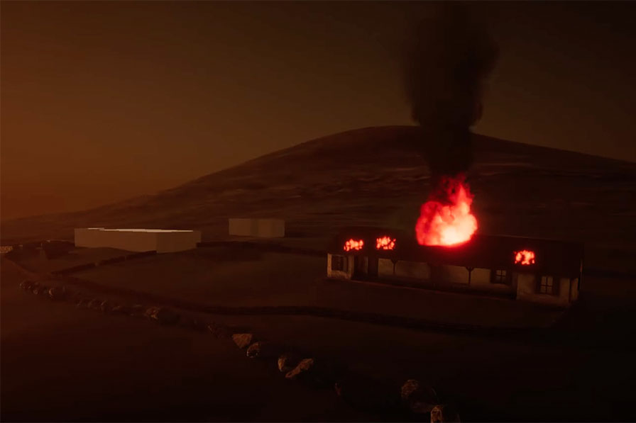 It was important to the progression of the battle to accurately portray the landscape. The terrain was constructed in Unity using lidar data, with google earth information overlayed. The complex as it appears today is not fully representative of how it existed at the time of the battle and so after some research, the few buildings were modelled in Cinema4d, textured in Substance Painter and brought into Unity.