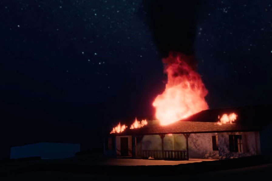 Night orbital shot showing the hospital ablaze